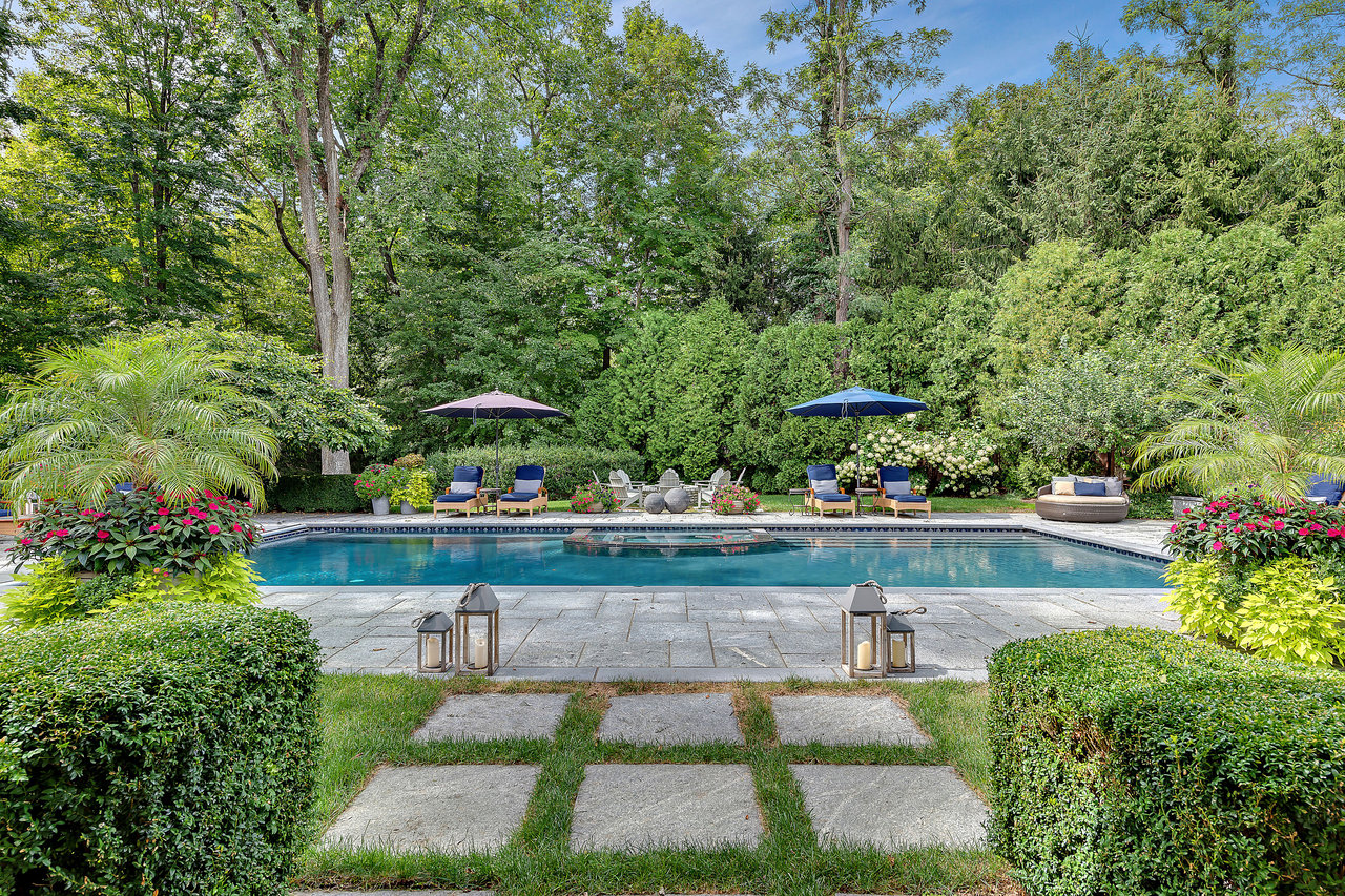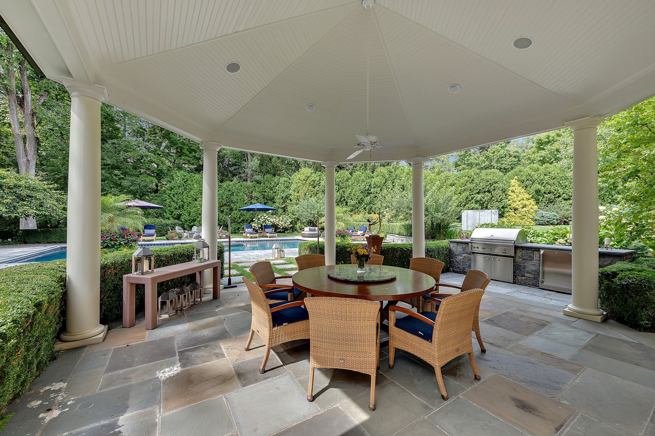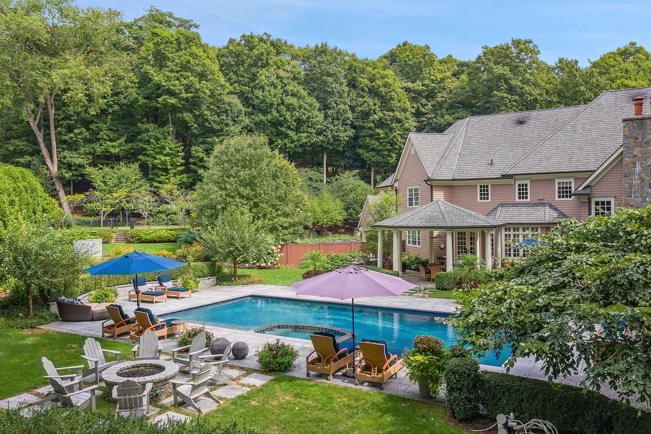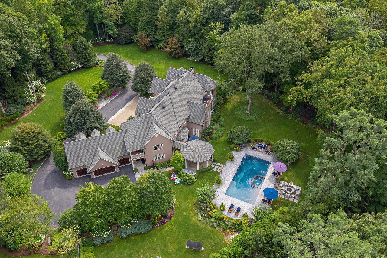 This impressive cedar and stone Colonial is elegantly positioned on an expansive 5+ acre, private resort-caliber property bordering protected land. Premium materials and custom finishes throughout. The interiors boast soaring ceilings, bespoke details, open floorplan and grand windows framing picturesque views of the manicured grounds. The elegant double-height entry foyer opens to formal rooms and segues to the heart of the home. Two offices and a game room with bar are set apart from the main rooms for privacy. An impressive two story family room segues to the gourmet kitchen and breakfast room. Retreat to the sumptuous primary bedroom suite on the upper level, complete with professionally designed bath offering radiant heated floors, an expansive double steam shower, and a striking stainless-steel bathtub. Completing this level are four ensuite bedrooms, an upper level family room, laundry and stairs to the attic. The walk-out lower level provides an additional full bath with a large rec room. The backyard is a true oasis, featuring an inviting pool with spa, fire pit, state-of-the-art outdoor kitchen with built-in refrigeration, and a putting green. Entertain in style beneath the rear covered terrace equipped with an advanced music system and ambient outdoor lighting. Additional highlights include a four-car heated garage, generator, and indoor and outdoor speakers. Located within the coveted Chappaqua school district, minutes to the train station, shopping and dining. Just 45 minutes to New York City. Epitomizing upscale living at its finest. Your weekend getaway, everyday.