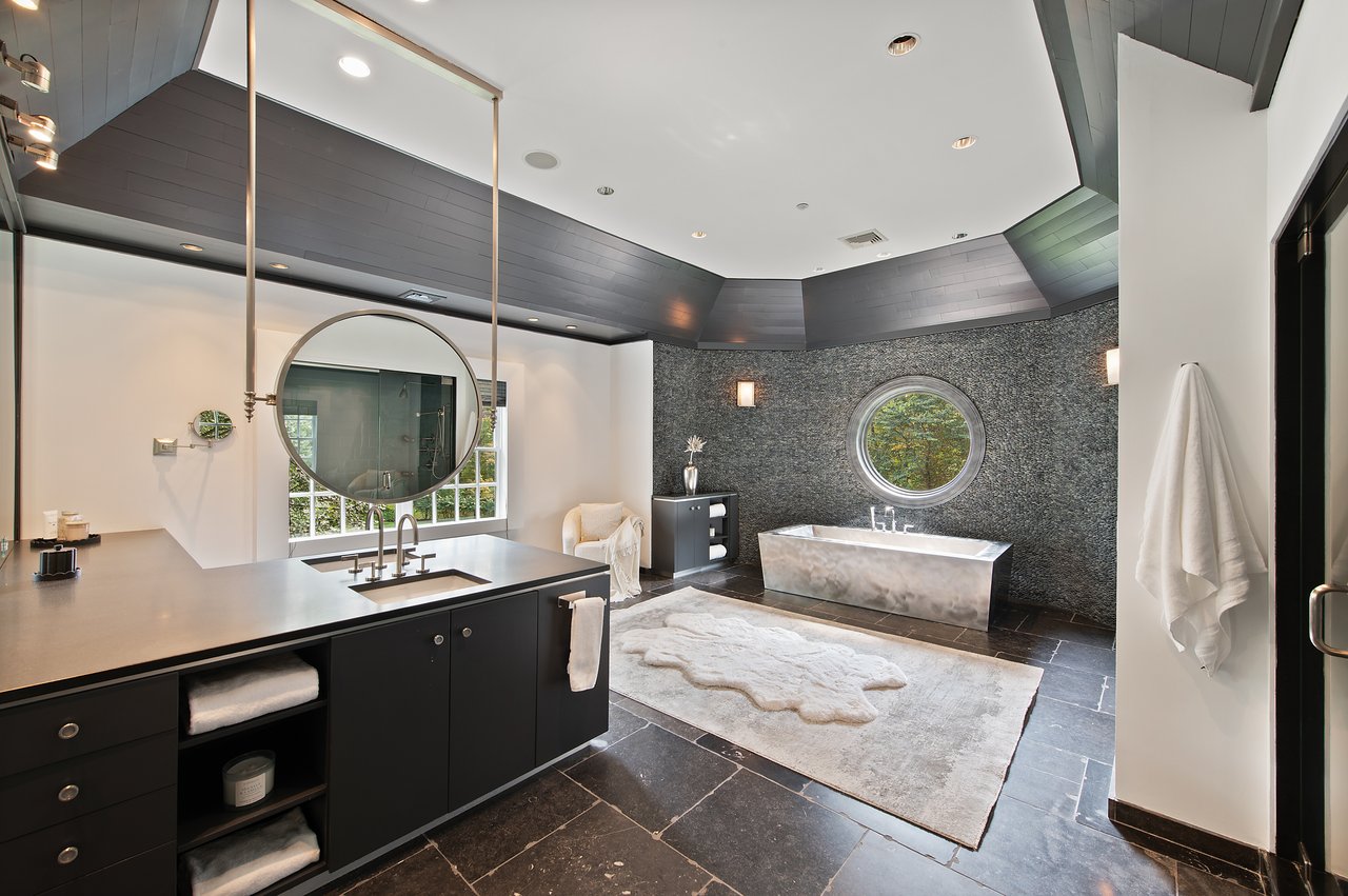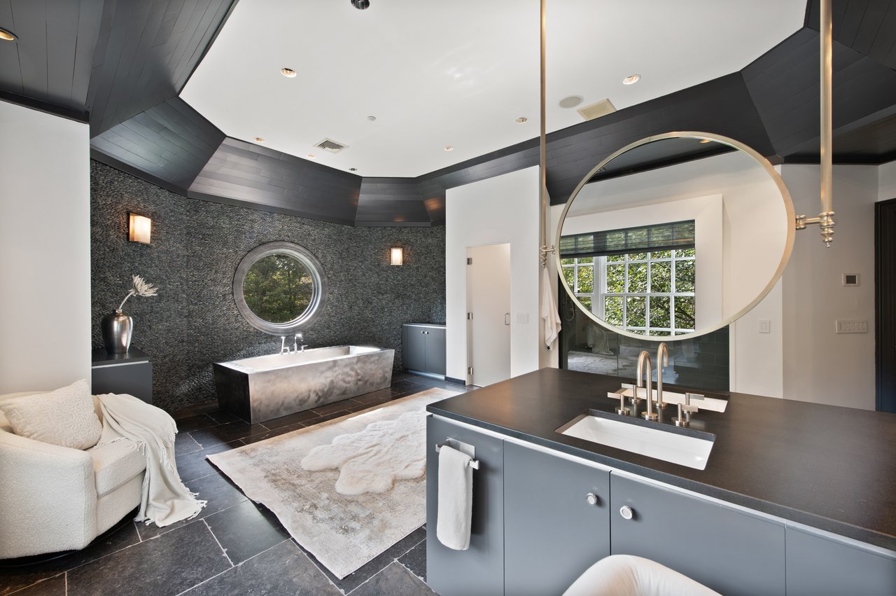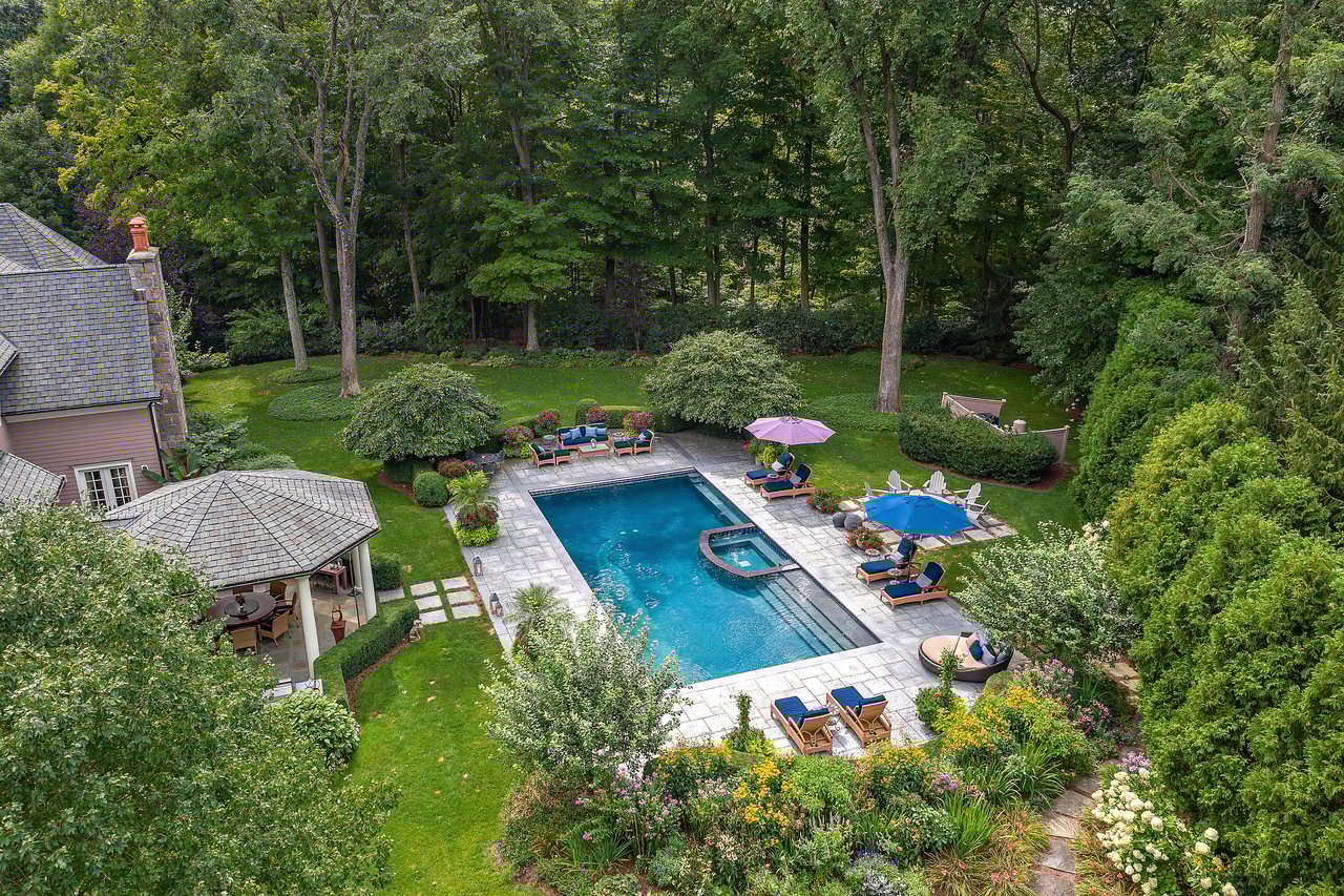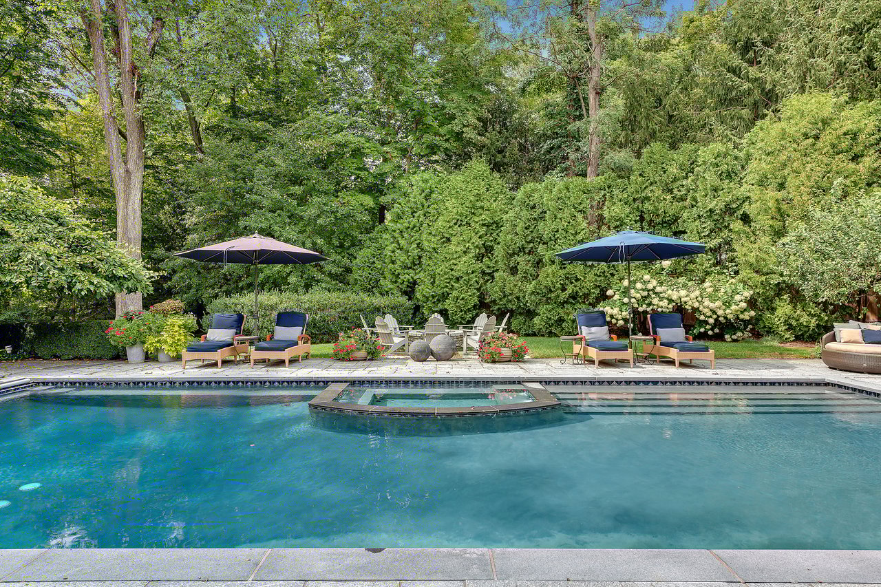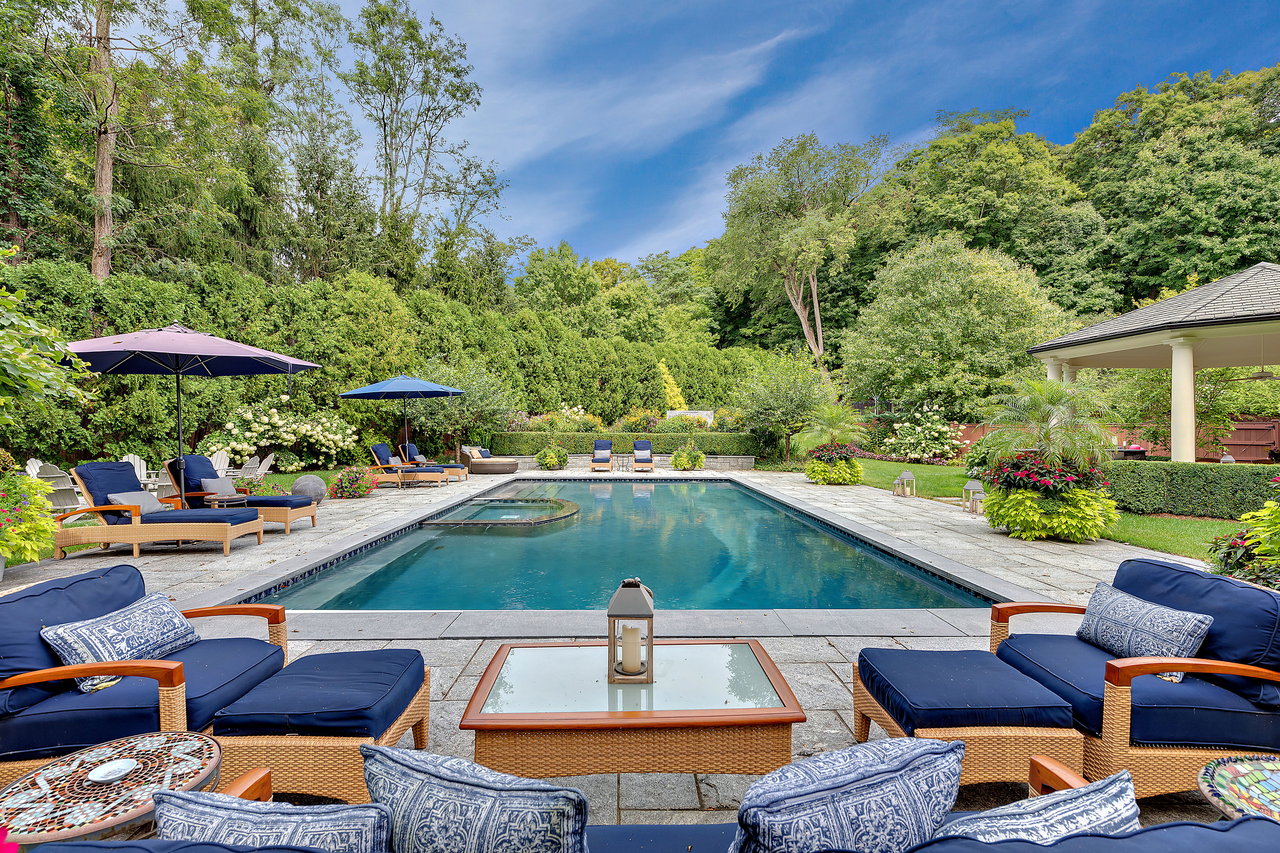 This impressive cedar and stone Colonial is elegantly positioned on an expansive 5+ acre, private resort-caliber property bordering protected land. Premium materials and custom finishes throughout. The interiors boast soaring ceilings, bespoke details, open floorplan and grand windows framing picturesque views of the manicured grounds. The elegant double-height entry foyer opens to formal rooms and segues to the heart of the home. Two offices and a game room with bar are set apart from the main rooms for privacy. An impressive two story family room segues to the gourmet kitchen and breakfast room. Retreat to the sumptuous primary bedroom suite on the upper level, complete with professionally designed bath offering radiant heated floors, an expansive double steam shower, and a striking stainless-steel bathtub. Completing this level are four ensuite bedrooms, an upper level family room, laundry and stairs to the attic. The walk-out lower level provides an additional full bath with a large rec room. The backyard is a true oasis, featuring an inviting pool with spa, fire pit, state-of-the-art outdoor kitchen with built-in refrigeration, and a putting green. Entertain in style beneath the rear covered terrace equipped with an advanced music system and ambient outdoor lighting. Additional highlights include a four-car heated garage, generator, and indoor and outdoor speakers. Located within the coveted Chappaqua school district, minutes to the train station, shopping and dining. Just 45 minutes to New York City. Epitomizing upscale living at its finest. Your weekend getaway, everyday.