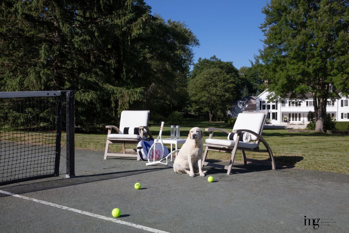 The Hamptons vibe at this stunning Colonial home is a rare blend of cool, casual, modern sophistication perfectly situated in a majestic, country setting. The beautifully scaled interior boasts clean, unfussy architectural lines with large, airy rooms that teem with natural light. The property is one of the area’s most epic 4.6 acres of level land dotted with colossal specimen spruce trees and vast, open views to the sky. A white Walpole picket fence atop a bucolic fieldstone wall completely surrounds the perimeter providing privacy for the resort-style pool/spa, tennis court, outdoor half-bath with custom dog shower and play areas, as well as extra safety for kids and pets. A gracious gated dual entry opens onto a breathtaking cobblestone courtyard. This iconic former home of Tommy Hilfiger has been superbly updated, both inside and out, and is immediately ready for today’s busy family life.